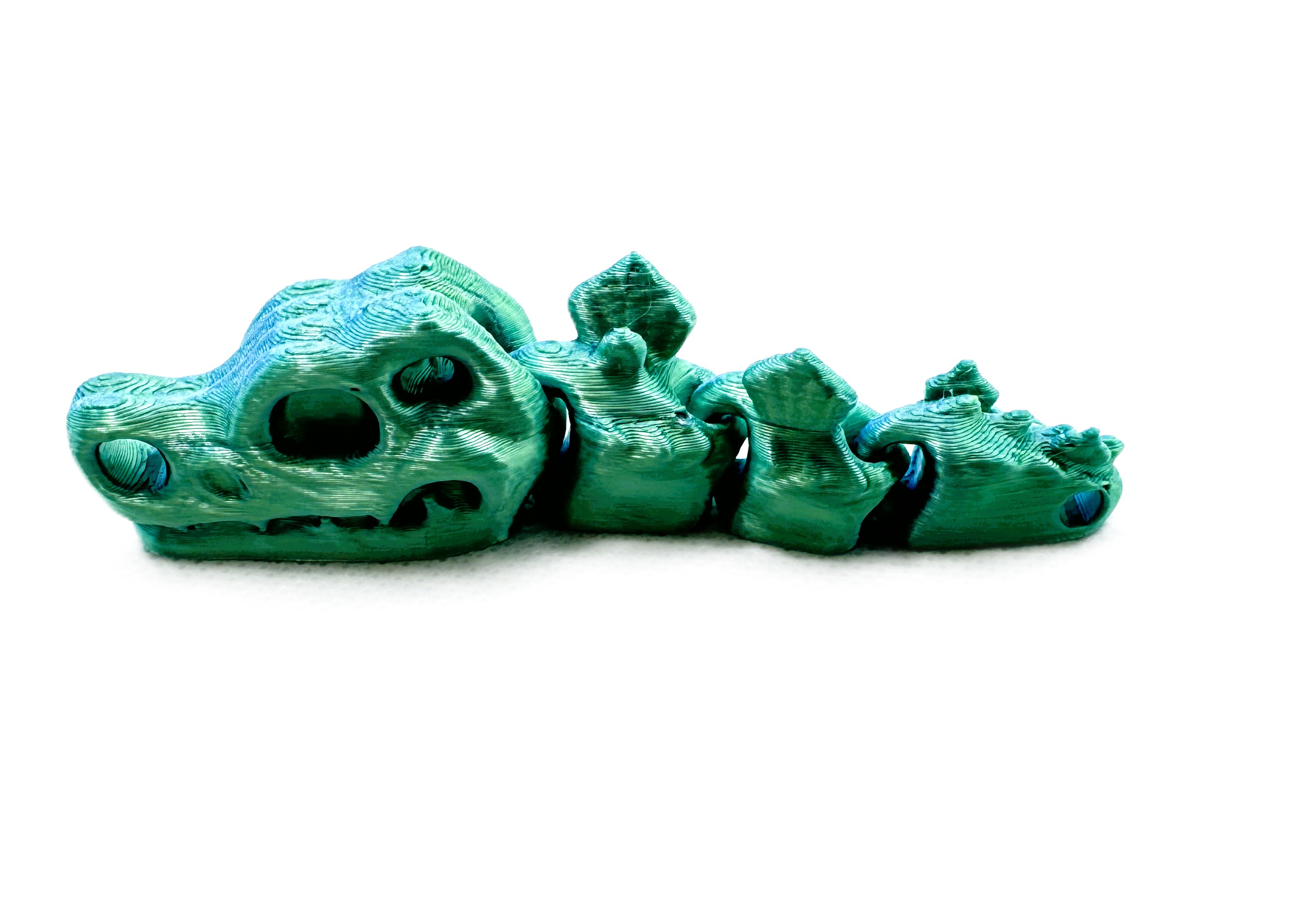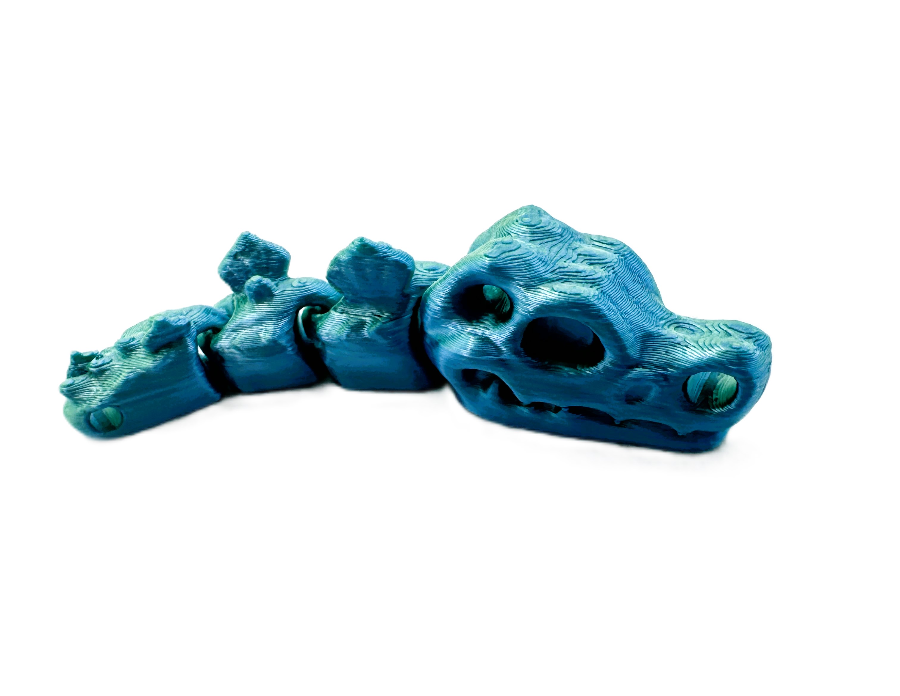 Szukasz wyjątkowego gadżetu? Postaw na nasz brelok Flexi Czaszki T-Rex w efektownym  Lagunowym kolorze (niebieski + zielony)! Elastyczna konstrukcja i futurystyczny design przyciągają wzrok i dodają charakteru kluczom, plecakowi czy torebce. Wydruk 3D z dbałością o detale, lekki i trwały. Idealny na prezent dla fana dinozaurów i niebanalnych dodatków!