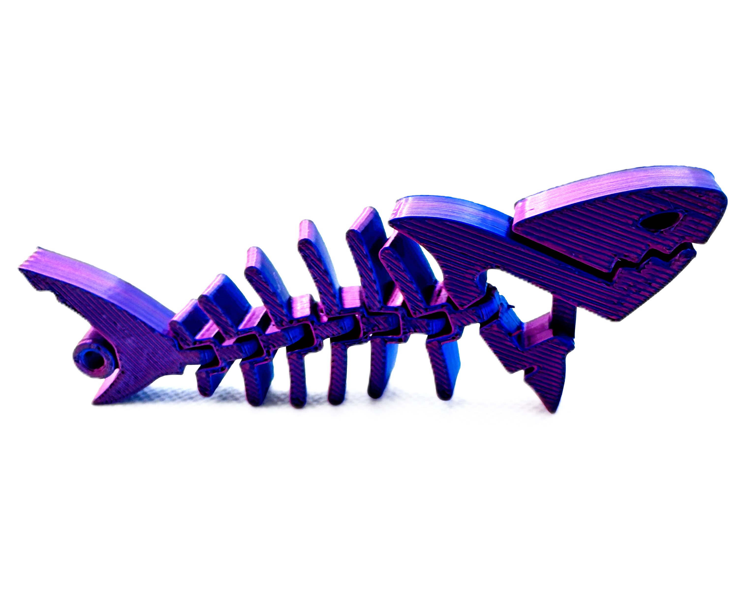 Ten mały rekinek to prawdziwa gwiazda oceanu – i… holograficznej magii! Wydrukowany w technologii 3D z elastycznych segmentów, porusza się płynnie i miękko, a jego powierzchnia mieni się wielokolorowym połyskiem w zależności od światła. Efekt „Magic Holo” nadaje mu nieziemski, przyciągający wzrok wygląd.