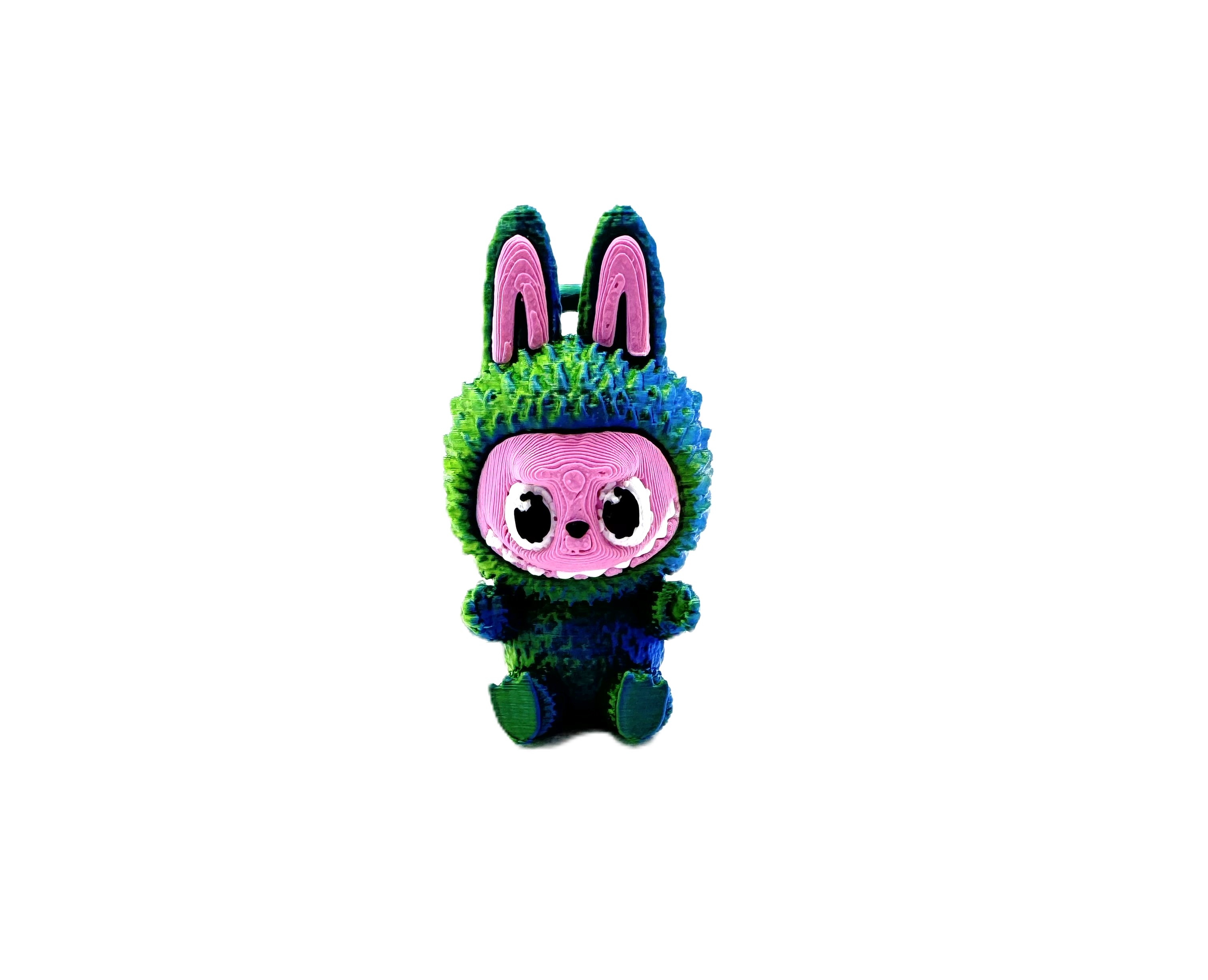 Ten uroczy brelok przedstawia postać Labubu — znaną z japońskich kolekcji figurek artystycznych — w niecodziennym, futrzastym stroju przypominającym króliczka. Ma duże, czarne oczy i charakterystyczną różową buzię z wyraźnie zarysowaną fakturą, która nadaje mu wyjątkowego uroku. Miękki kolorystyka w odcieniach zieleni, niebieskiego i różu przyciąga wzrok i sprawia, że brelok świetnie prezentuje się przy kluczach, torbie czy plecaku.